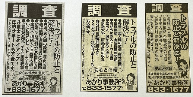 沖縄県公安委員会 探偵業届出 第97070001号 (一社)日本調査業協会 正会員 第1491号 認定資格「探偵業務取扱主任者」保有