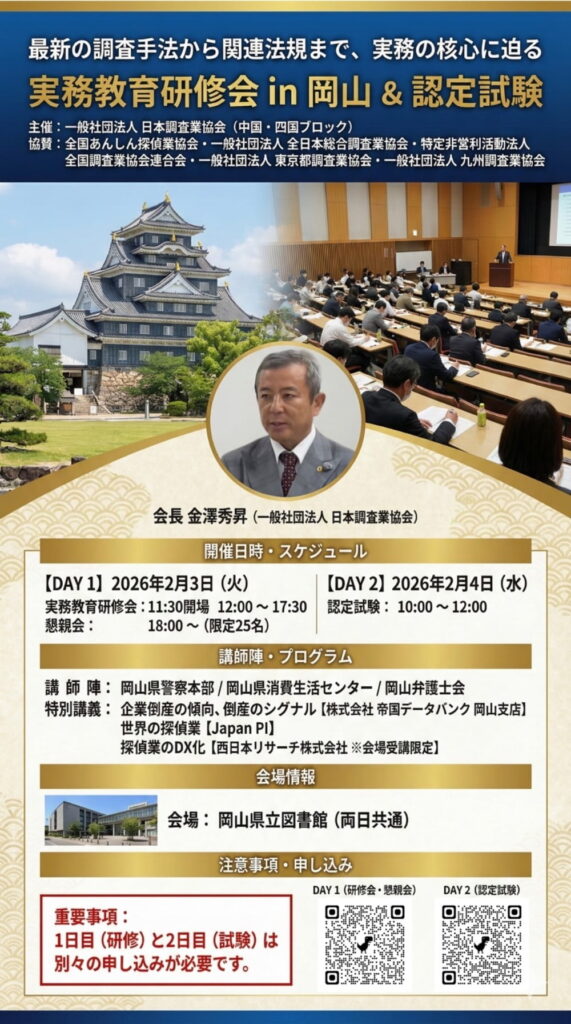 当社が、平成13年から入会している日本国内で唯一の探偵調査業者の全国組織「(一社)日本調査業協会」が主催する「探偵業実務教育研修会」が2月3日に岡山県で開催されます。